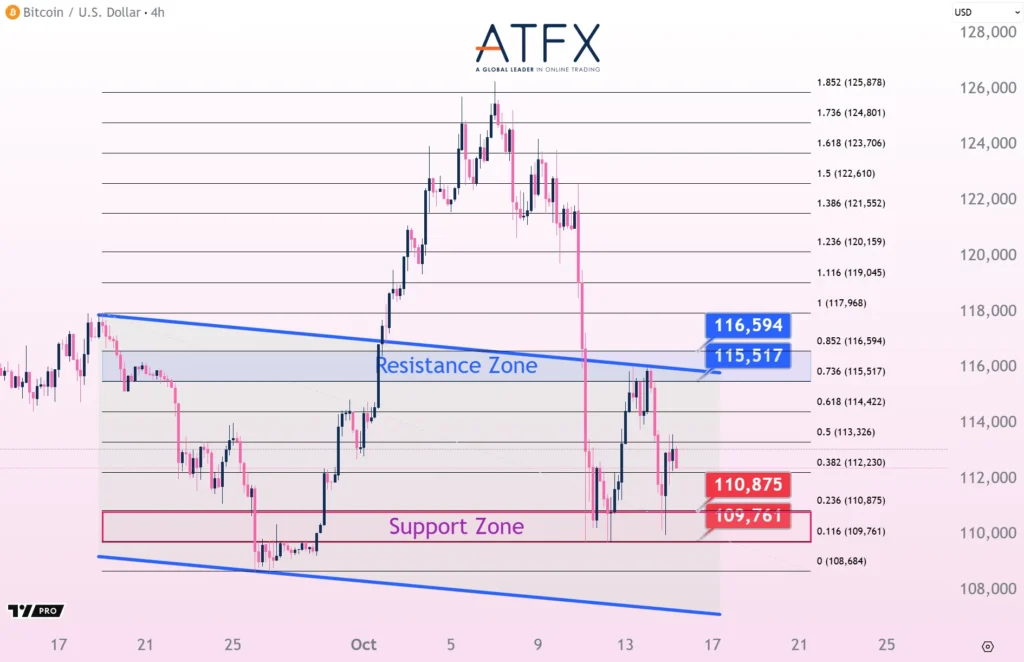 Bitcoin slid from the $126K peak to $110,770 as U.S.-China trade tensions fueled risk aversion and safe-haven flows into gold. Technically, BTC holds support near $110,875, with potential to rebound toward $115,517, while a break lower risks retesting the critical $103,800 level, with risks of further liquidation if the critical level breaks.