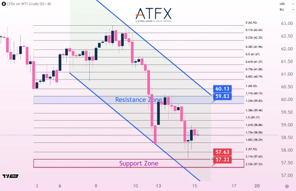 WTI slumped to $58.70, its lowest in five months, after the IEA projected a potential four mbpd surplus in 2026, while renewed U.S.-China trade tensions weighed on demand sentiment. Technically, price remains capped by the descending trendline near $59.83, with bearish momentum pointing toward support at $57.63. A sustained break below this level could extend losses toward the mid-$56 zone.