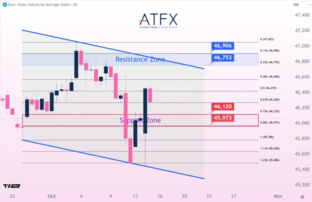 The Dow Futures rose 0.44% to 46,270, supported by industrials as Caterpillar surged 4.5%, while bank earnings showed strength but with mixed stock reactions. Price is reclaiming ground above the 46,120 support zone, breaking through a descending trendline. If buyers sustain momentum, the index could extend gains toward 46,753 resistance.