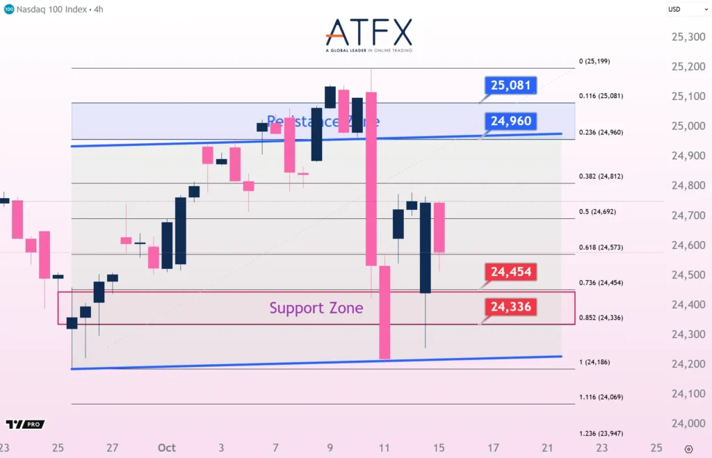 The NAS100 fell 0.76%, pressured by renewed U.S.-China trade war fears, which outweighed earlier AI-chip sector strength. The index is stabilizing above 24,454 key support, with buyers defending this level. If the rebound extends, upside potential targets the 24,960 resistance zone. A failure to hold 24,454 could expose the market to deeper pullbacks toward 24,200.