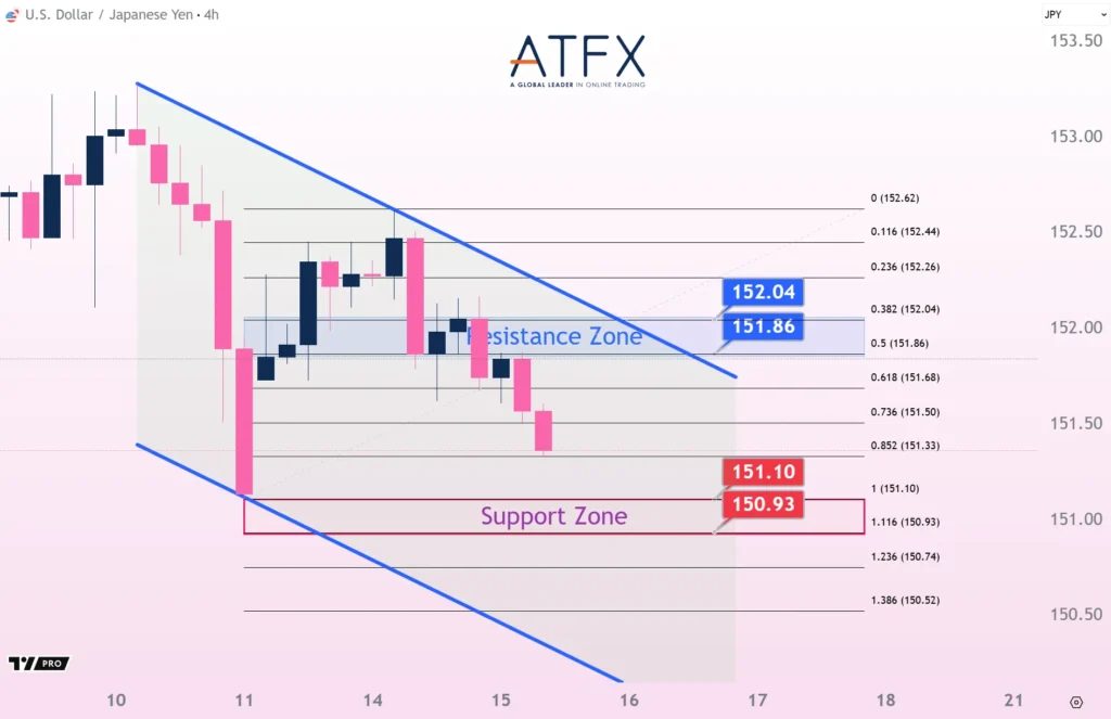 USD/JPY edged lower to 151.80 as U.S.-China trade frictions revived Yen demand, while Powell reaffirmed prospects for a Fed cut this month. The pair is trading below a descending trendline with resistance at 151.86. Unless it breaks above, the structure suggests a bearish continuation toward 150.93. Only a decisive reclaim of 151.86 would neutralize near-term downside pressure.