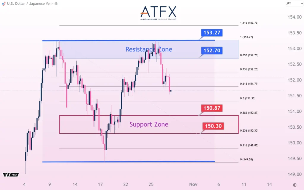日本经济财政政策大臣城内实和美国财政部长的评论,缓解了部分对日本采取更多扩张性财政和货币政策的担忧,日元兑美元从连续七天的跌势中反弹。美元兑日元昨日录得近三周以来最大跌幅后下试10日均线,该位及20日均线所在的151.80至151.30暂时提供支撑,聚焦美联储决议后汇价会否跌离关键均线抑或寻得反弹重返近期高位区间。