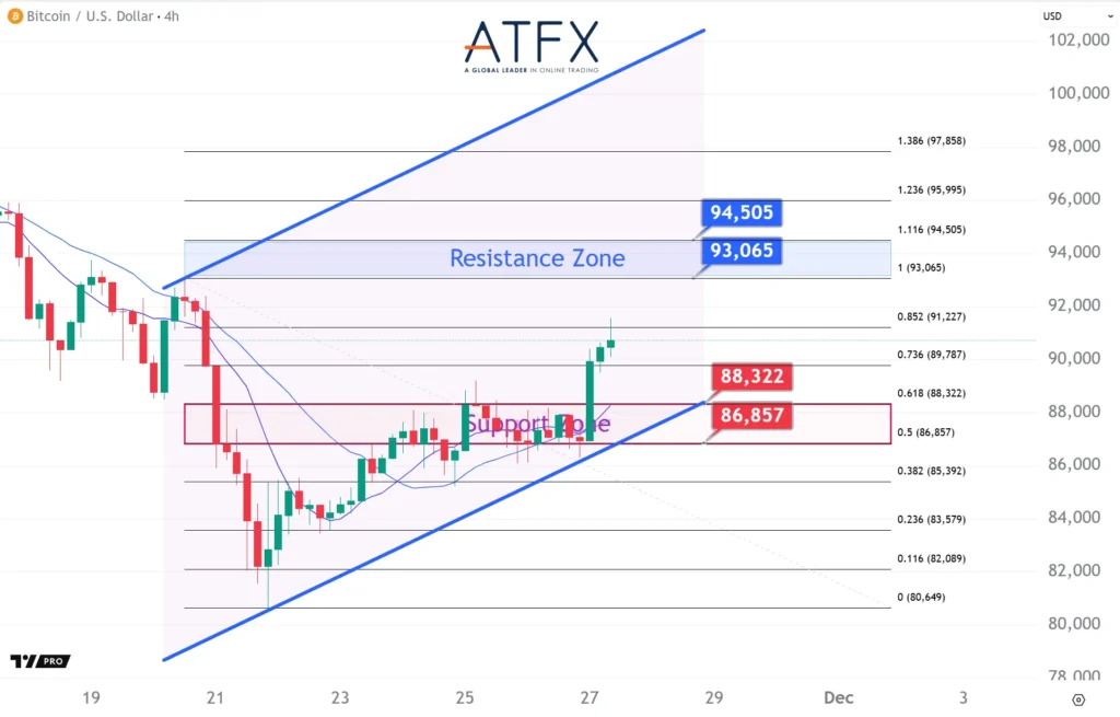 Bitcoin reclaimed $90,000 as Fed rate-cut expectations lifted risk sentiment, supported by a softer dollar and firmer gold. Technically, BTC is holding above the rising trendline, with bulls eyeing a move toward 93,000 if it retests and targets the 88,322–86,857 support zone. Stronger U.S. labor data remains a modest cap on upside momentum.
