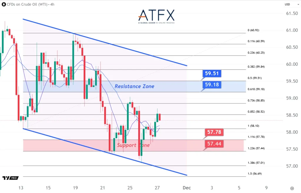 WTI rebounded toward $58.60 after touching a one-month low, as markets weighed oversupply concerns against progress in Russia-Ukraine peace talks. A surprise 2.8M-barrel jump in U.S. crude inventories added demand uncertainty. Technically, prices are attempting to reclaim the broken trendline, with support at $57.78; a sustained hold could open the door to a push toward $59.18.