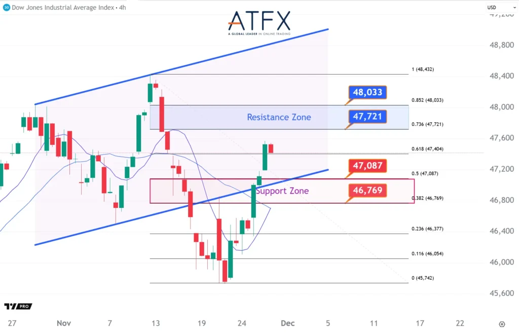 The Dow futures climbed 0.67% for a fourth consecutive session as firm Fed rate-cut expectations and sector strength in tech and airlines kept risk appetite supported. Technically, the index is holding above 47,087 support and forming a steady higher-low structure, with potential to retest the 47,721 resistance zone if buyers maintain momentum.