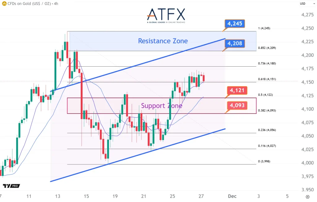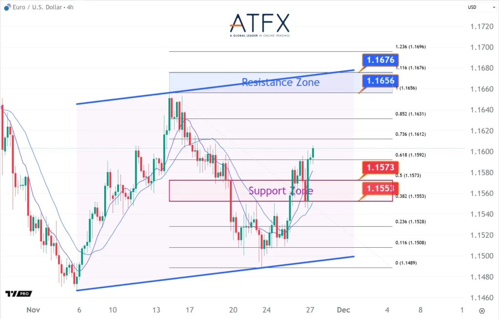 EUR/USD edged toward 1.1590 as Fed rate-cut expectations held near 85%, keeping the dollar broadly pressured ahead of the Thanksgiving break. Technically, the pair is holding above 1.1573 support, with room to extend toward 1.1655 if the pullback structure completes, and buyers defend the higher-low zone. Soft Eurozone sentiment capped gains but was offset by a steady ECB tone.