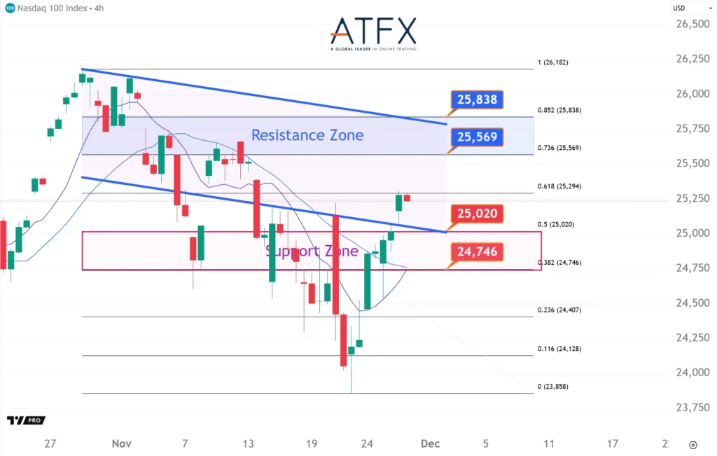 NAS100 rose 0.82% as tech momentum returned, led by Dell’s nearly 6% jump on strong guidance. With Fed rate-cut expectations anchoring sentiment ahead of Thanksgiving, the index holds above 25,200 support. It is forming a higher-low pattern, suggesting room for a push toward the 25,569 resistance zone.