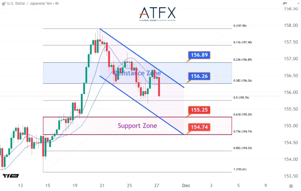 USD/JPY eased to around 156.40 after briefly dipping to 155.66, as markets weighed chatter of potential BoJ tightening while doubting its ability to shift long-term yen pressure. Holiday-thin liquidity kept traders alert to possible FX intervention. Technically, the pair remains capped below the descending trendline, with price vulnerable to further downside toward 155.25 if the rebound fails.