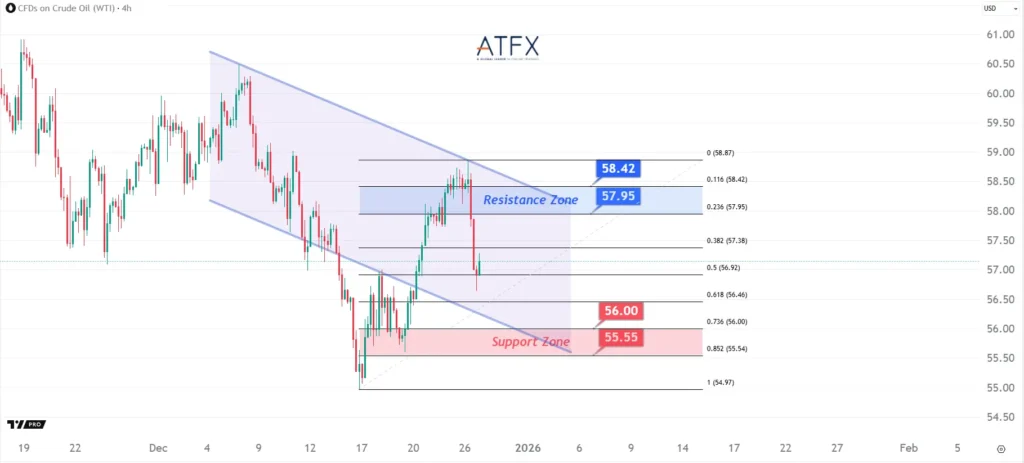 Oil prices remains headline-driven as Russia–Ukraine talks underpin downside risks while oversupply concerns cap rebounds. Technically, the rebound stalled near the 57.95–58.42 resistance zone, suggesting range trading rather than a trend reversal at this stage.
