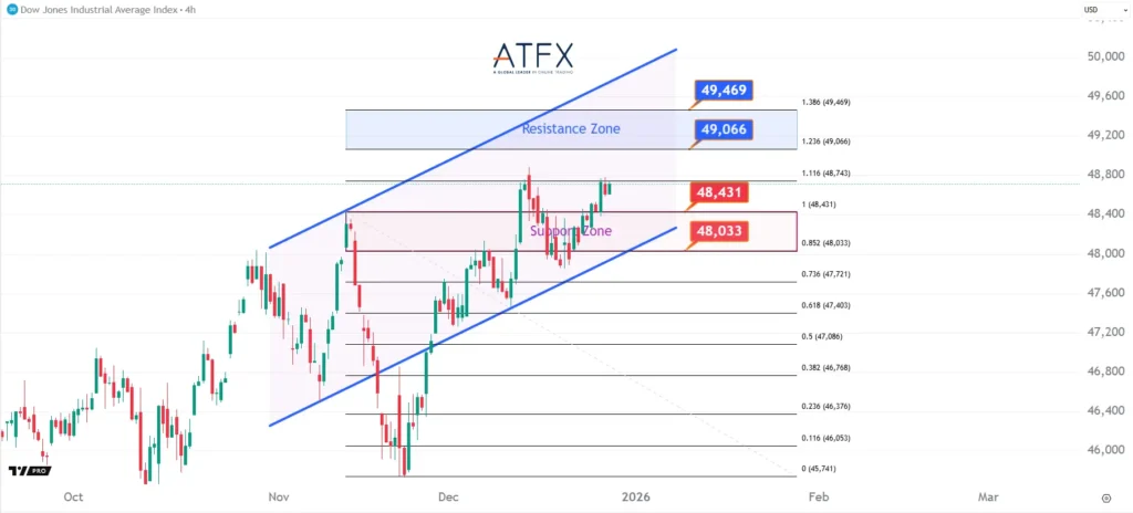 The Dow Futures remain close to record highs amid thin holiday liquidity, underpinned by expectations of Fed easing. Technically, the index continues to consolidate above 48,033–48,431, while upside attempts are being tested near the 49,066–49,469 resistance zone, suggesting consolidation rather than a decisive breakout for now.