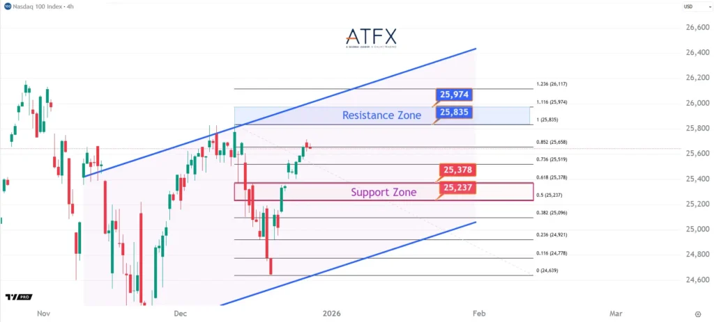 The NAS100 remains resilient, supported by ongoing strength in AI-related names. Technically, the index rebounded from the 25,237–25,378 support zone and is edging toward the 25,835–25,974 resistance area, where upside momentum may pause and shift into consolidation rather than a sharp reversal.