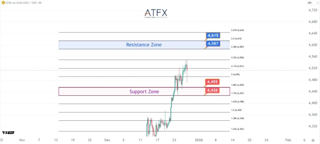 Gold stays firm near record levels, underpinned by Fed cut expectations, a softer dollar and geopolitical tensions. From a technical view, dips found demand around $4,426–$4,455, while upside momentum now faces the $4,587–$4,615 resistance zone, with thin liquidity amplifying price swings.