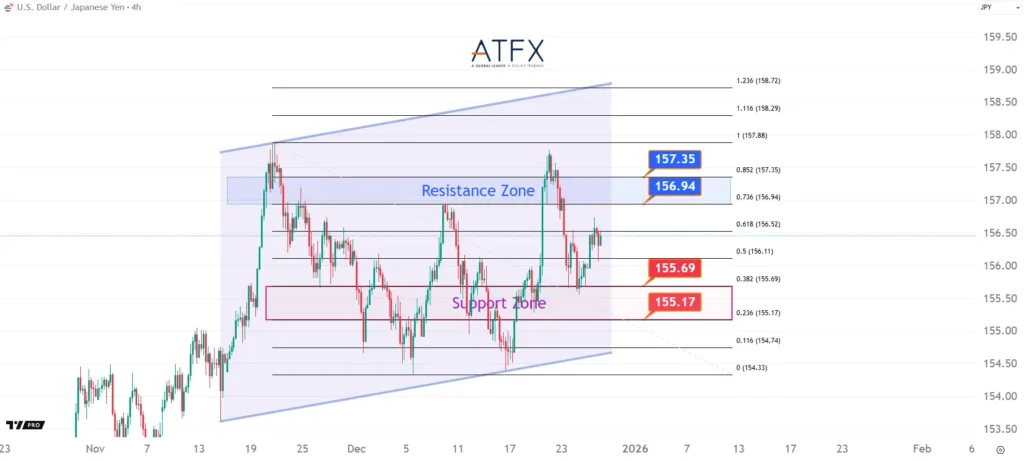 USD/JPY remains choppy as repeated intervention rhetoric from Japanese officials tempers upside follow-through. Technically, price continues to oscillate within a rising range, but rejection near the 157 area suggests near-term consolidation rather than a clean breakout.