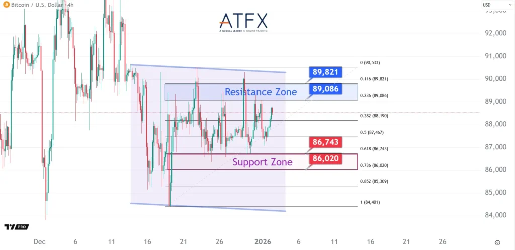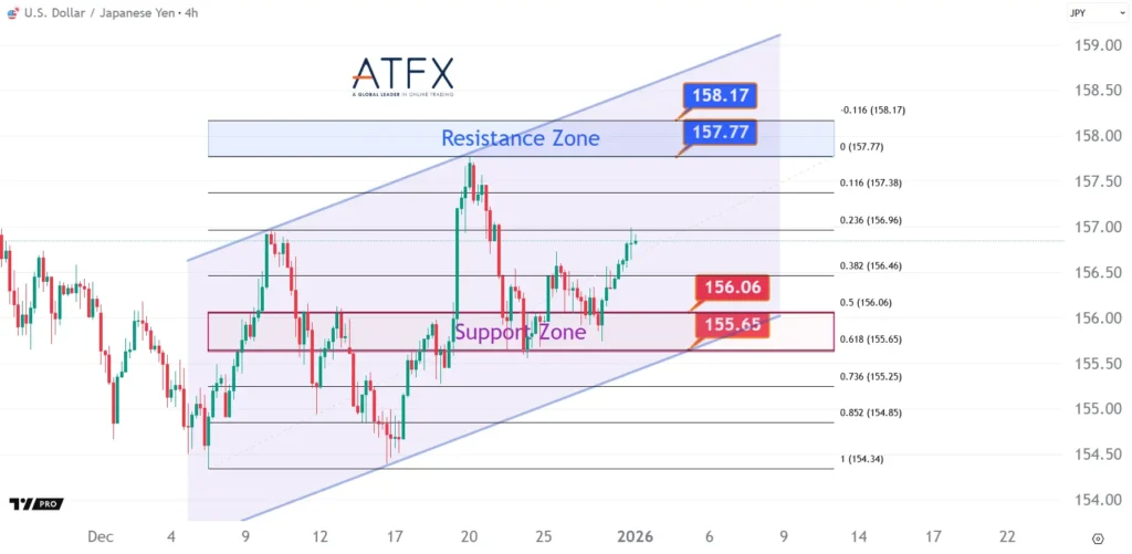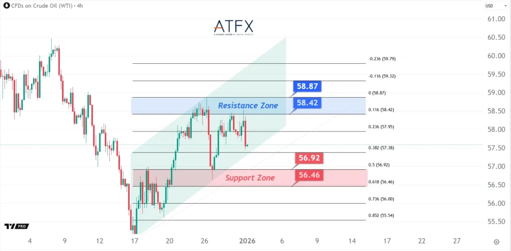Oil prices remain resilient amid thin holiday trading, supported by rising geopolitical risk premiums linked to the Russia–Ukraine conflict and energy infrastructure attacks. Technically, WTI is consolidating within an ascending channel, with resistance near 58.42–58.87 and key support at 56.46–56.92.