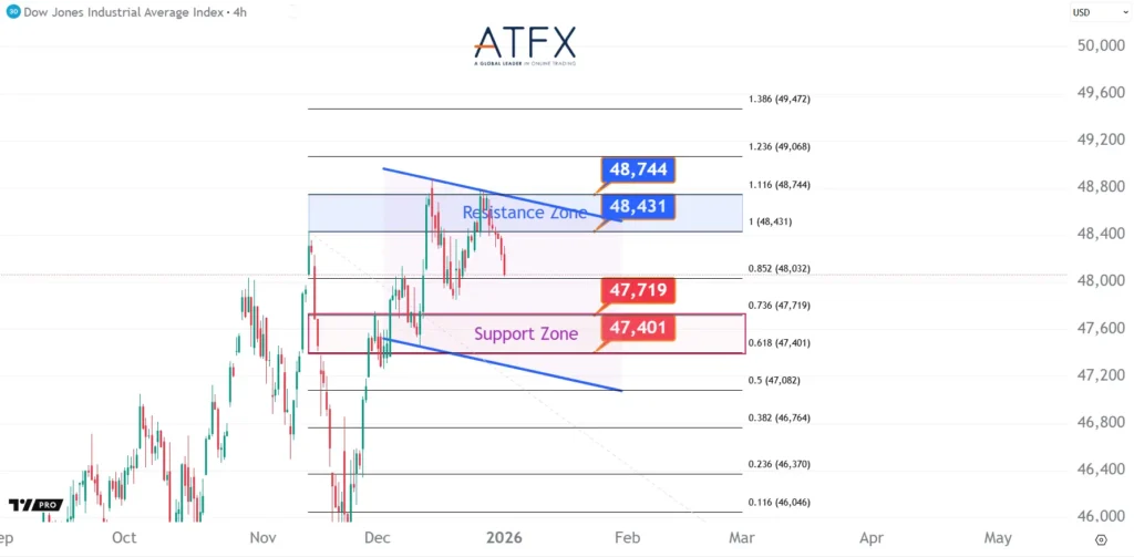 U.S. equities remain cautious at the start of the year amid fiscal uncertainty and political risks. The Dow was rejected near the 48,744–48,431 resistance zone and has pulled back into the middle of its ascending channel, with 47,719–47,401 acting as key support. The structure suggests high-level consolidation rather than a trend reversal.
