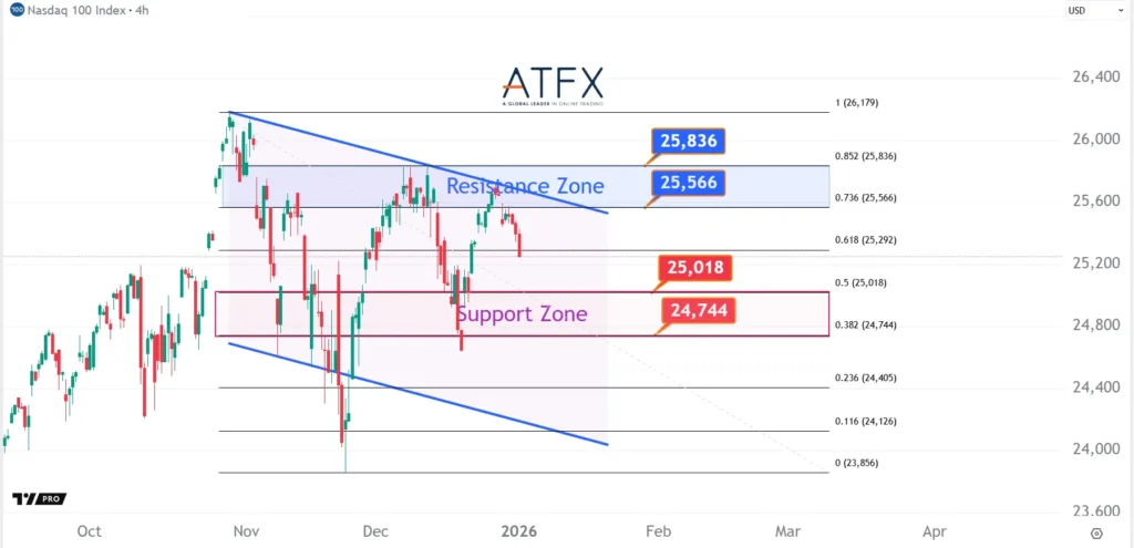 The NAS100 is consolidating near record highs as profit-taking in tech stocks tempers short-term sentiment. Rate-cut expectations and the medium-term AI theme continue to provide underlying support. Technically, price remains capped by resistance but holds within an overall ascending structure.