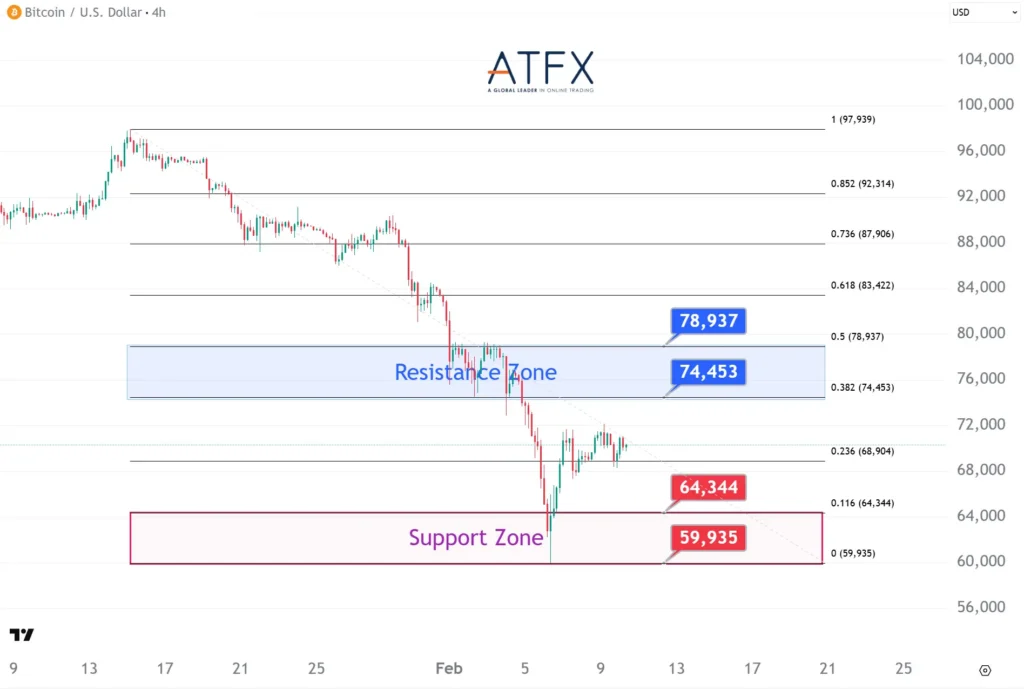 Bitcoin stabilised above $70,000 after last week’s sharp selloff, supported by improved risk sentiment following Japan’s election and a rebound in tech stocks. However, the $74,453–78,937 zone remains a key resistance level, and price action is likely to remain corrective and volatile ahead of U.S. jobs and CPI data.