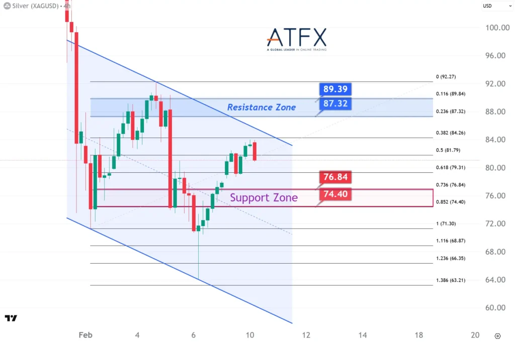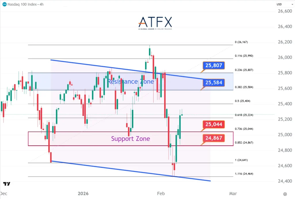 The NAS100 extended its rebound, led by software and mega-cap tech stocks, though heavy AI capex and stretched valuations continue to cap risk appetite. The index bounced from the 24,867–25,044 support zone, with upside now testing the 25,584–25,807 resistance area. Failure to clear this zone may keep the price range-bound.