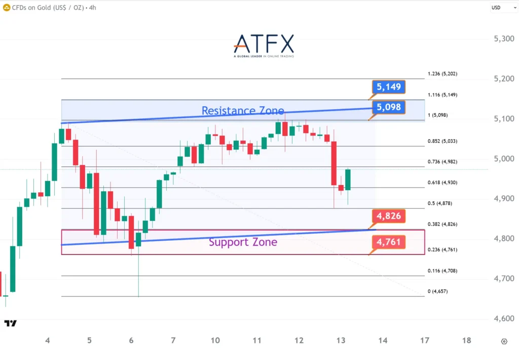 Gold slid below $5,000 to $4,915 after strong U.S. jobs data dampened rate-cut bets and triggered stops. Price is now probing the $4,826–4,761 support zone; holding here may allow a rebound towards $5,098–5,149, while a sustained break could open the door to a deeper corrective phase as sentiment turns cautious ahead of CPI.