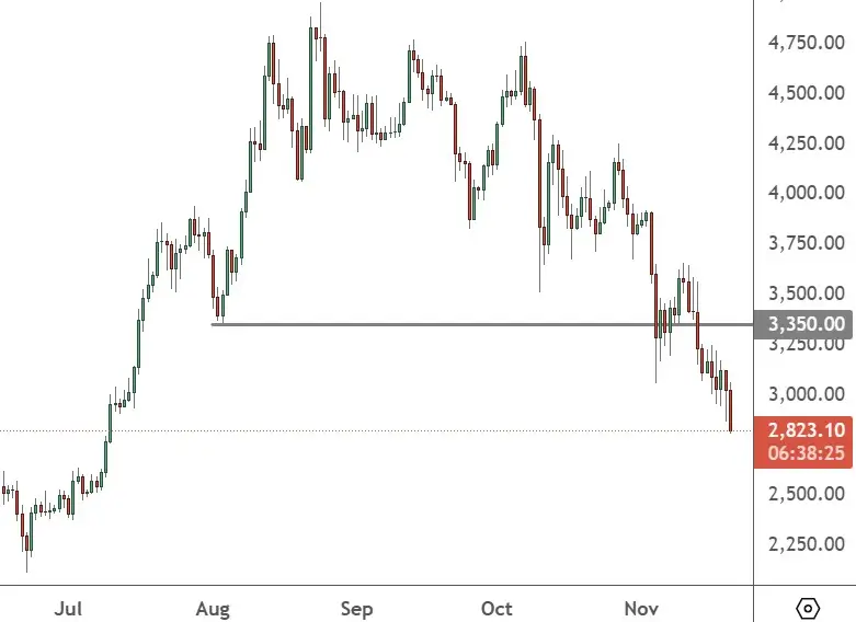 以太币未能重新夺回3350美元的水平,并且正在进一步下跌。投资者应该警惕低成交量下跌至之前的支撑位,但2,500美元是第一个目标。