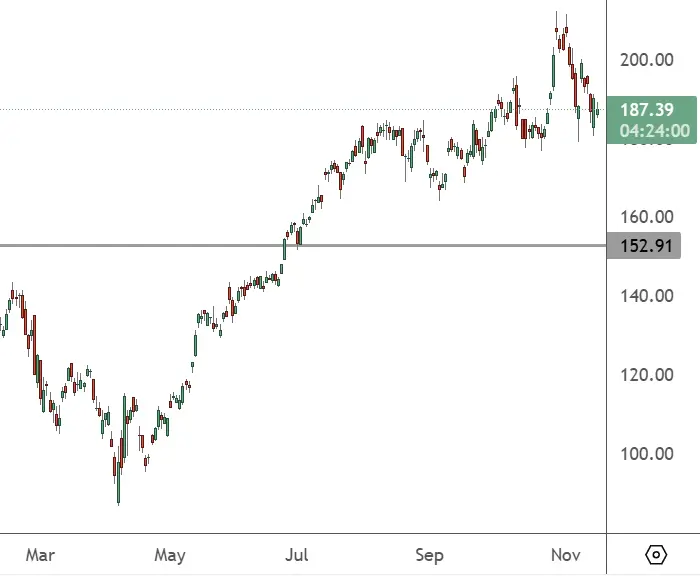 The price of NVDA is seeking to hold the support around $180-90. If that level fails, then the stock could be looking at the December 2024 highs near $153.
