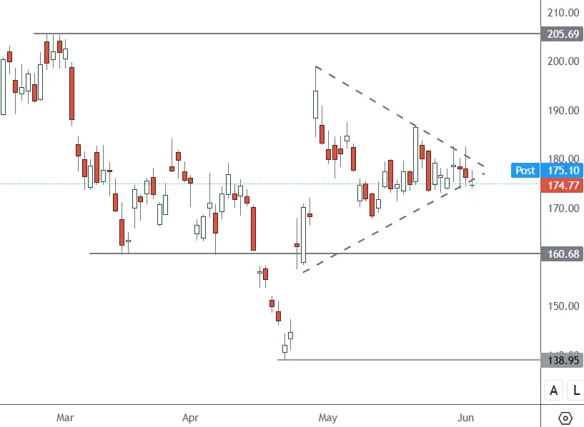 TSLA stock trades in a triangle formation, which has tightened and looks ready to break out. Support for a lower move costs $160.68, and the higher resistance is $200-205.