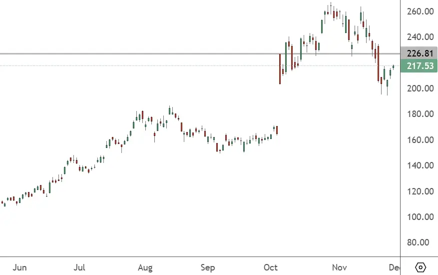 AMD has fallen from its recent highs at $260 and has key resistance at $226.81. If the resistance fails, the gap could open up a possible move to $170.