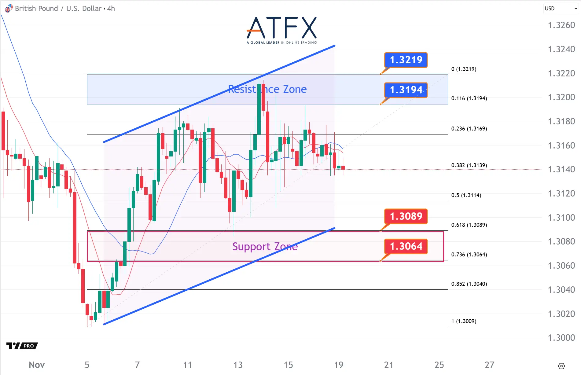 【20251124 行情回顾】 美国股市在上周五反弹,因投资者加大押注美联储将在下月降息,不过受科技股估值过高的担忧影响,三大主要指数周线均下跌。全周道指下跌1.9%,标普500指数下跌约2%,纳斯达克指数下跌2.7%。 美联储威廉姆斯做出鸽派发言,市场加大对12月降息的押注。美元指数仍触及5月下旬以来最高,并创下六周来最大单周涨幅。欧元兑美元下跌0.16%,至1.1511,周线下跌1%。 上周五金价下跌,盘中一度跌幅逾1%,现货金收跌0.28%报每盎司4065.39美元,全周下跌0.34%。油价下跌约1%,创一个月新低,周线下跌约3%,因美国推动俄乌达成和平协议,可能提振全球石油供应,而美国利率的不确定性抑制了投资者的风险偏好。 【20251124 重点前瞻】 本周市场将迎来一系列重要经济数据和央行动态,预计将引发市场波动。美国方面在假期前公布聚焦零售销售及PPI,而英国秋季预算的公布将决定英镑的走势以及英国央行12月降息预期。此外,新西兰联储利率决议以及欧洲央行行长拉加德的讲话也将受到市场关注。 【重要财经日历】 日本假期 17:00 德国11月Ifo商业景气指数 ** 22:30 美国11月达拉斯联储制造业指数 ** 11月25日 15:00 德国第三季度GDP年率终值 ** 21:30 美国9月零售销售 ** 23:00 美国11月咨商会消费者信心指数 ** 23:00 美国10月成屋销售 ** 23:00 美国11月里士满联储制造业指数 ** 【20251124 行情分析】 欧元兑美元 1.1539/1.1562阻力 1.1467/1.1445支持 欧洲央行行长拉加德表示,如有必要,央行将调整利率以维持2%的目标。欧元/美元上周五录得六日连,盘中一度跌破1.1500,所以月初的低位范围仍在视线当中,关注1.1467在前期低位附近有望再次发挥关键的支撑,继续关注本周欧美各大数据指引。 英镑兑美元 1.3137/1.3168阻力 1.3040/1.3009支持 在英国令人失望的零售销售数据和喜忧参半的PMI数据影响下,英镑/美元在上周五录得连续两日的反弹,不过未能获得动力突破1.3100关口,本周市场集中观望秋季预算的公布来决定英国经济和降息前景,当前先聚焦汇价能否坚守4小时图主要均线上方来稳固反弹动能。 美元兑日元 157.39/157.89阻力 156.25/155.75支持 上周五日本首相高市早苗公布大规模财政刺激措施,此前日本官员加强口头干预以阻止日元下跌,美元兑日元上周五跟随向下止步四连涨,不过周一亚市早段再度反弹,没有脱离1月以来的高位,所以关注重新反弹的尝试,但需要留意4小时图主要均线阻力以及日本方面对于汇率的任何言论都可能影响其波动。 美国原油期货(1月) 58.52/58.85阻力 57.01/56.69支持 在美国力促俄乌达成和平协议的拖累下,上周五国际原油连续第三个交易日下跌至一个月低位,自10月下旬以来首次跌破58美元,当前继续在下行通道内扩张,跌破主要均线后聚焦10月下旬低位是否成为目标,但也有望捍卫56美元。 现货黄金 4108/4161阻力 3981/3939支持 现货白银 51.28/51.74阻力 48.98/48.60支持 上周五现货黄金盘中跌超1%后一度转涨但未能守住升幅,美联储威廉姆斯讲话后市场对美联储降息预期升温,暂时为金价提供支撑。技术上金价连续两日呈现多空交集,但空头小幅占优,在重新上破4小时图主要均线的情况下可以缓和压力,观望本周美国更多数据对于12月降息预期的指引。 美国道琼斯工业指数期货US30 46593/46945阻力 45452/45105支持 美联储官员对于降息的“鸽声”提振市场,上周五美股在前一日大跌后迎来反弹,道指从10月中旬低位反弹,重回46000关口之上,本周美国更多数据回归加上假期,美股可能经历进一步波动,道指当前反弹仍面临4小时图均线阻力的挑战。 美国纳斯达克指数NAS100 24728/24961阻力 23741/23445支持 上周五市场情绪改善的情况下,大型科技股涨跌不一,市场近段时间因科技股估值担忧和降息预期受挫而持续低迷,本周继续聚焦美国数据进一步指引。纳指上周五经过了震荡后小幅收高,但仍没有脱离逾一个月低位范围,所以关注能否守稳24000关口之上寻求更大的反弹 动能。 香港恒生指数HK50 25861/26113阻力 25294/25048支持 港股上周累计收跌1352点后,今早高开反弹逾200点,主要科技股普遍回稳。HK50指数上周五探底回升,一度刷新10月10日以来低位,但在逼近25000关口前掉头并小幅收高,日内关注反弹动能的延续,但需要突破4小时图均线后挑战趋势线阻力。 内容仅供参考:市场有风险,投资需谨慎。祝交易愉快!
