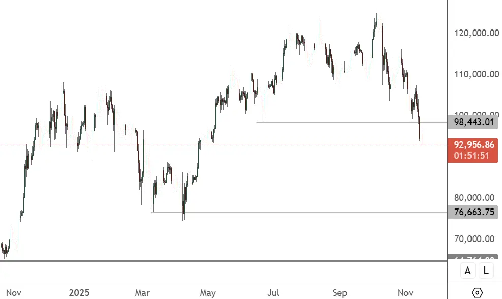 上周,比特币测试了10万美元的关键水平,随着我们开始新的一周,比特币的小幅反弹导致其进一步跌破9.3万美元。金价有可能涨至8万美元,因为在这一水平以下几乎没有支撑。