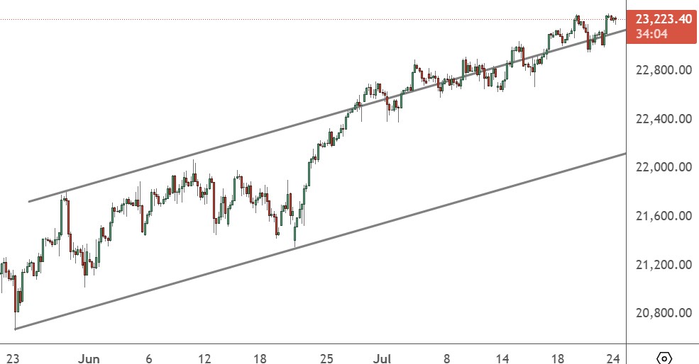 纳斯达克100指数自5月以来一直在尝试上升趋势线,并继续看到买盘进入。有可能再走高,但如果回调,目标将是22000点。
